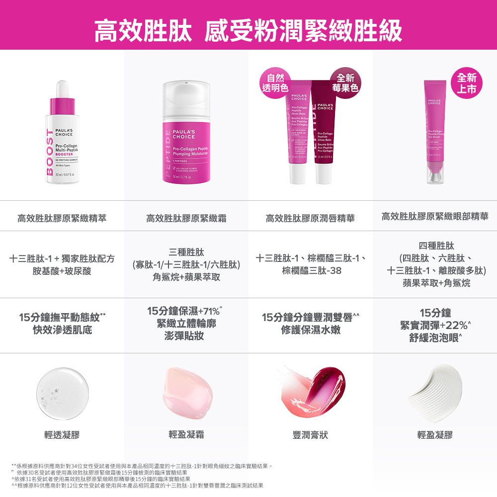 寶拉珍選獨家高效胜肽精華-高效胜肽膠原緊緻精萃,特添加十三胜肽-1,研究實證15分鐘即可快速撫平動態紋路*!