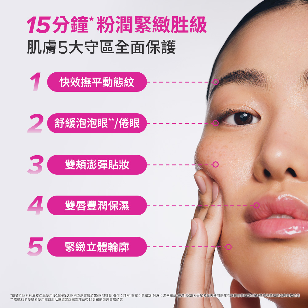 #15分鐘撫紋精萃 採用全球獨家胜肽科技,為肌膚注入的膠原彈潤因子,幫助穩固肌膚,有效提升肌膚彈性、緊緻度及強韌度。