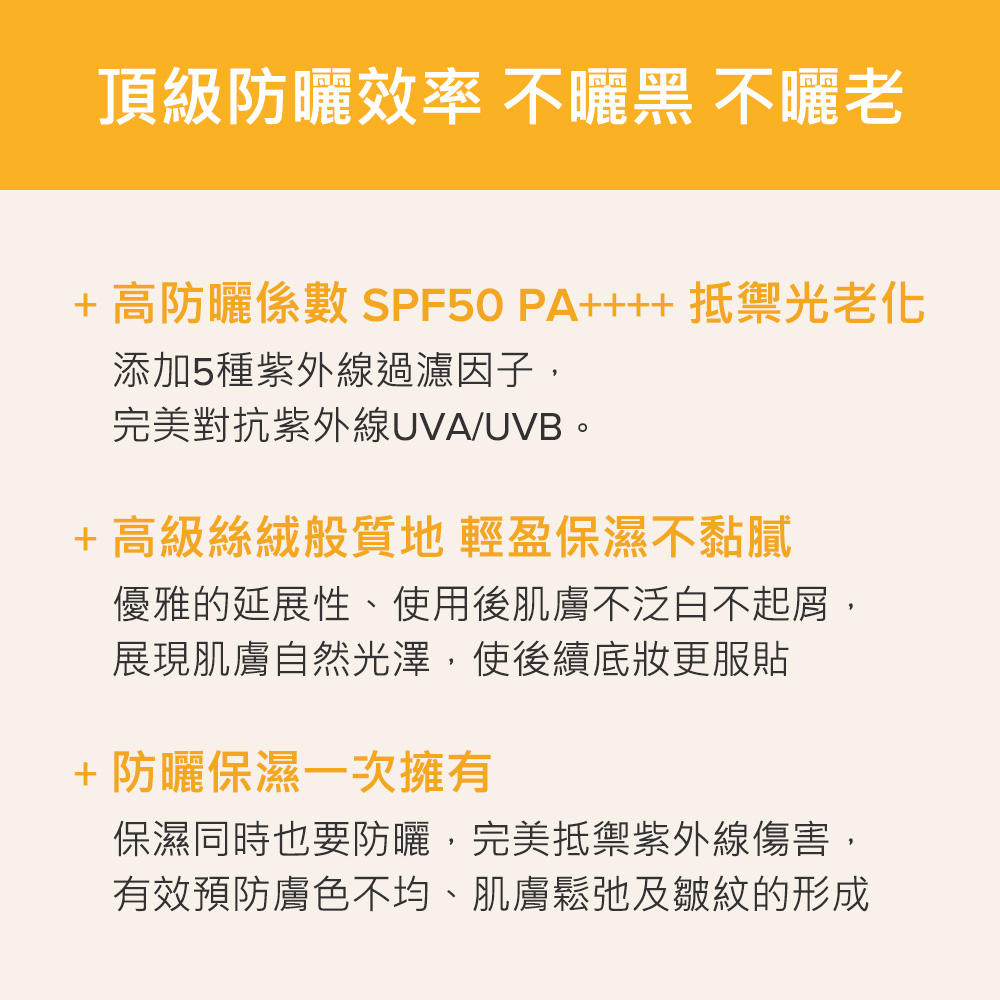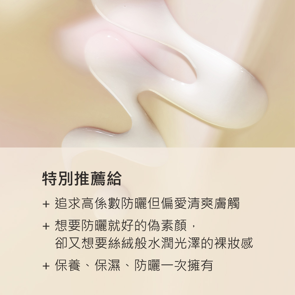 +滑順好推,不泛白、不起屑,防曬同時保濕,展現肌膚水潤健康的光澤