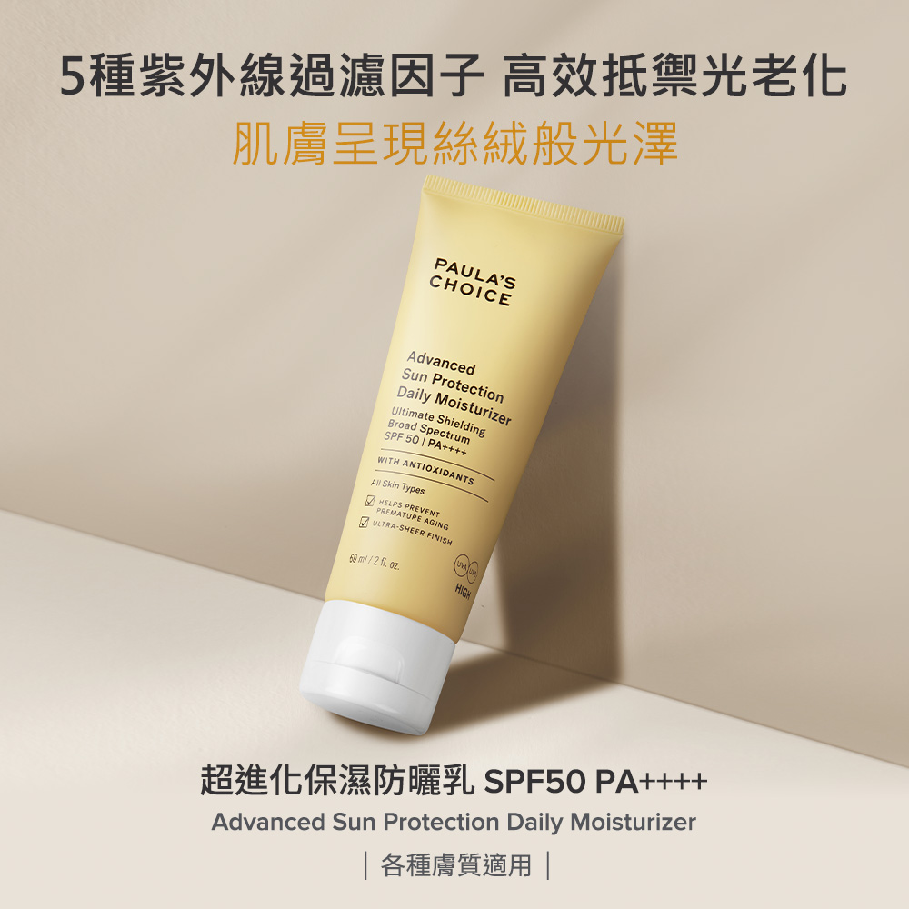 寶拉珍選的超進化保濕防曬乳SPF50 PA++++是一款保濕的化學型防曬乳,它採用了5種紫外線過濾因子,能高效抵禦紫外線UVA和UVB對肌膚造成的斑點、皺紋等光老化問題。絲絨般的質地有別於一般防曬乳的黏膩,輕盈防曬的同時也為肌膚帶來健康光澤。