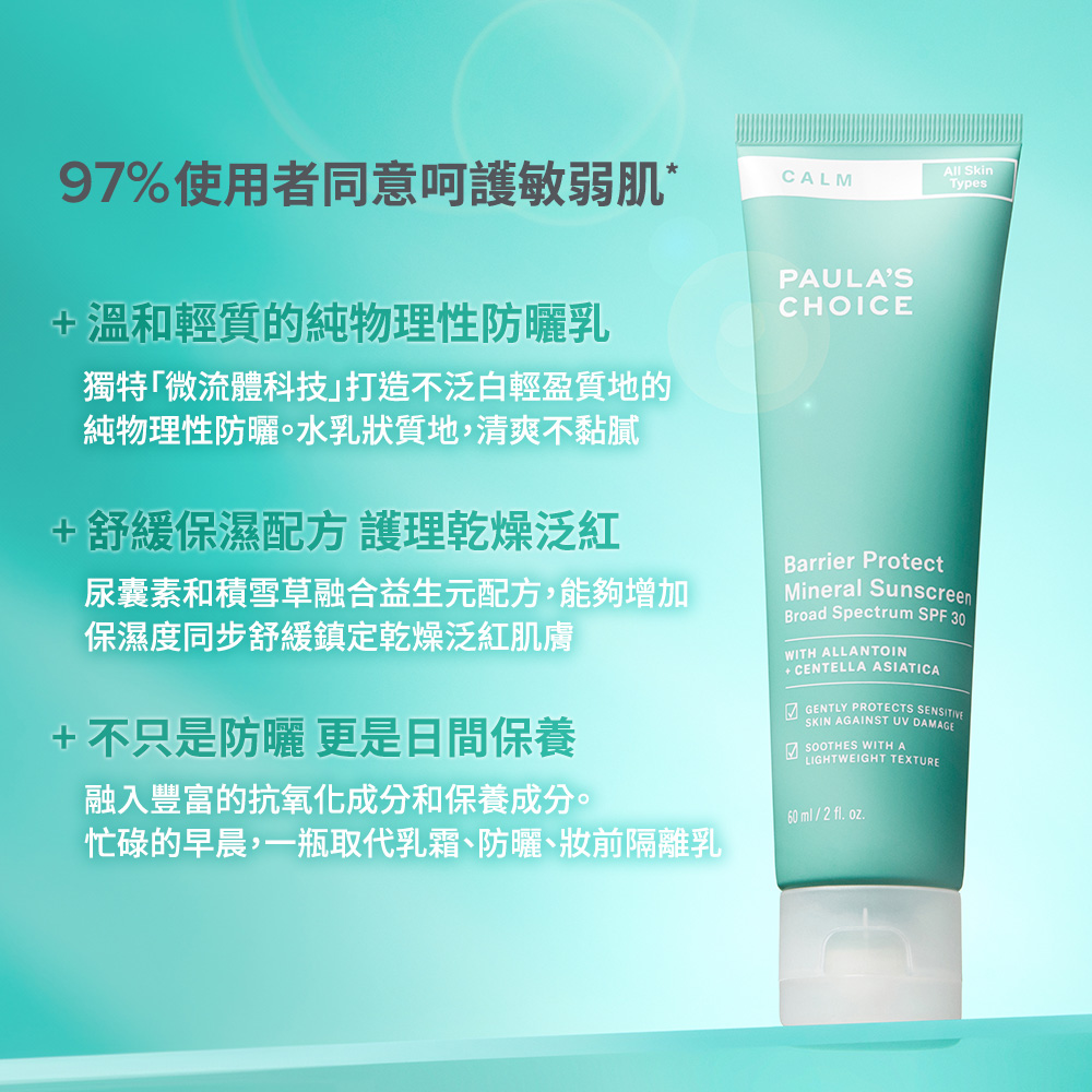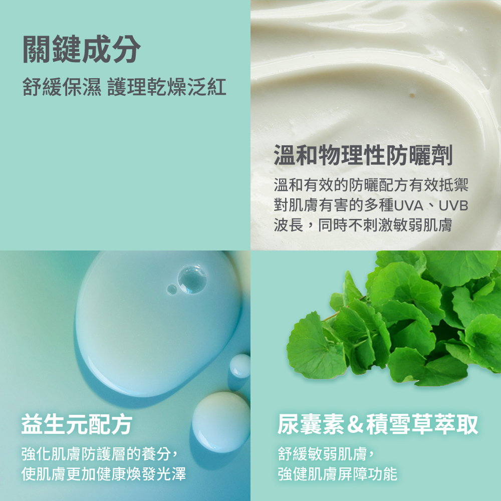 A:舒敏保濕系列是專為敏感肌膚打造的系列,日曬是導致肌膚受傷的主因之一。舒敏保濕防曬乳採用物理性防曬成分,質地絲滑、輕盈,含有尿囊素、積雪草和植物油等舒緩成分結合益生元配方,能有效保護敏弱的肌膚,任何膚質都適用。