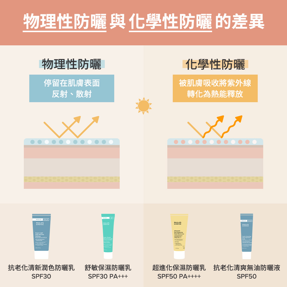 A:寶拉珍選的防曬產品為保養型防曬乳,防曬兼具保濕潤澤抗氧化的好處,若本身肌膚較乾燥可以在塗抹防曬產品前,依據需求疊擦乳液/乳霜。